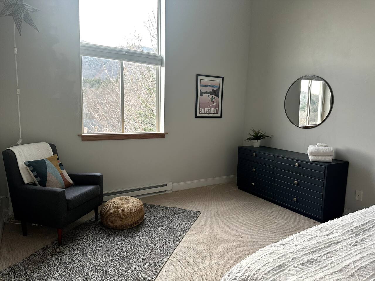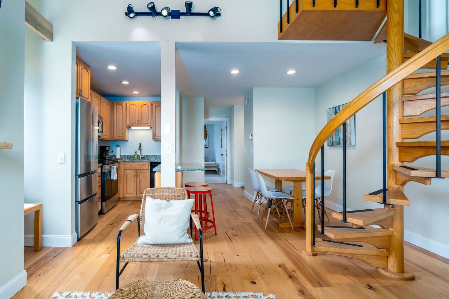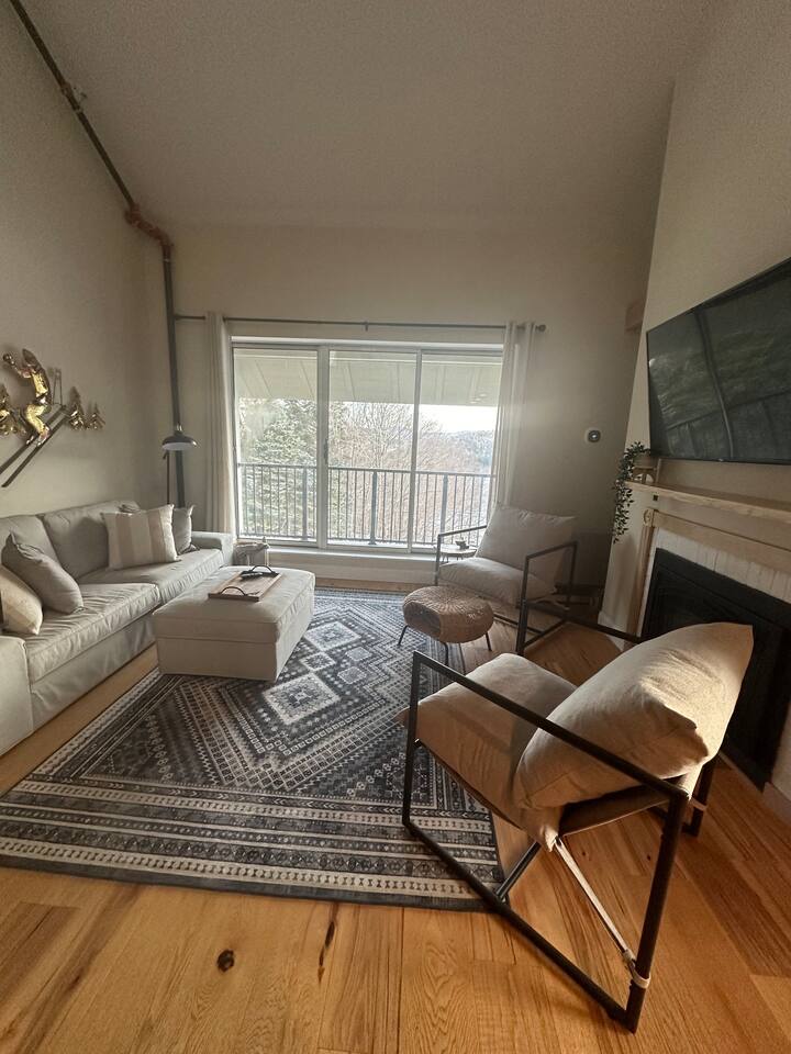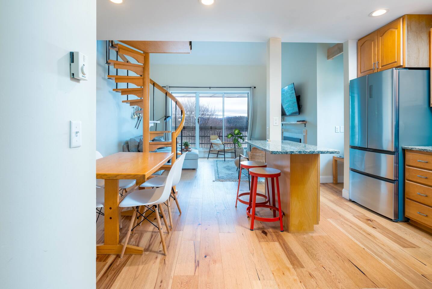 While the proximity to skiing/hiking/biking/exploring is certainly the main draw we've created a space that offers modern comforts to welcome you home. Ditch your boots and gear in the mudroom as you enter the condo (3 sets of stairs from building entrance). A small hallway leads you to the kitchen, living area, 1st floor bathroom and bedroom. The living space is equipped with a cozy fireplace, smart TV and large slider that leads to the balcony. Enjoy your morning coffee or sundowner on the private balcony overlooking the valley. The fully-equipped kitchen is stocked with cooking essentials. There is seating for four at the table or pull up a stool at the island for more informal dining. The first floor bedroom is furnished with a queen and a twin bed and is located right next door to the full bathroom with a tub shower. The main bedroom is lofted and accessed by a spiral staircase. It's furnished with a king-size bed & seating area where you can take in the beautiful views of the resort and mountains. There is a washer/dryer in the unit as well!