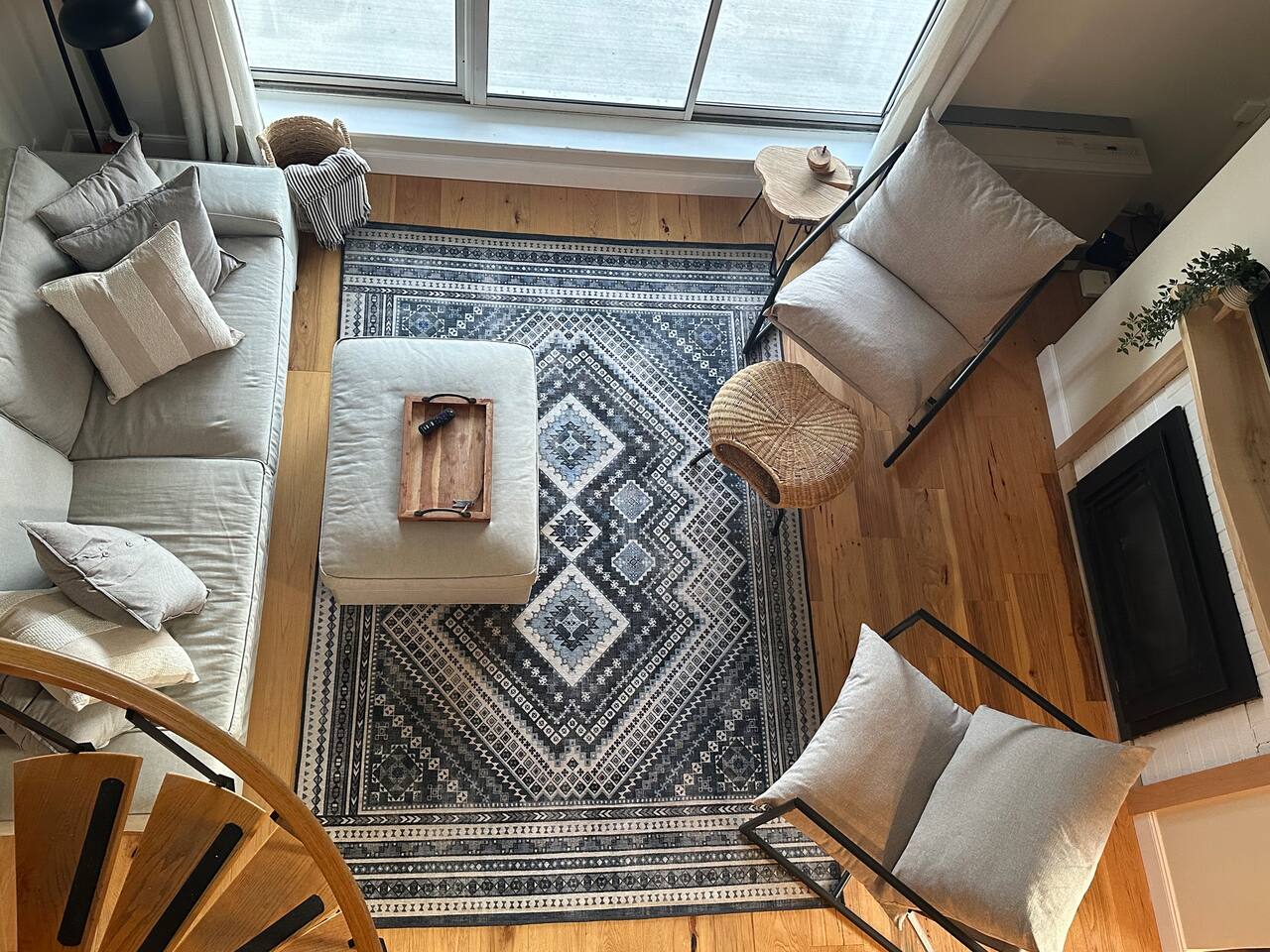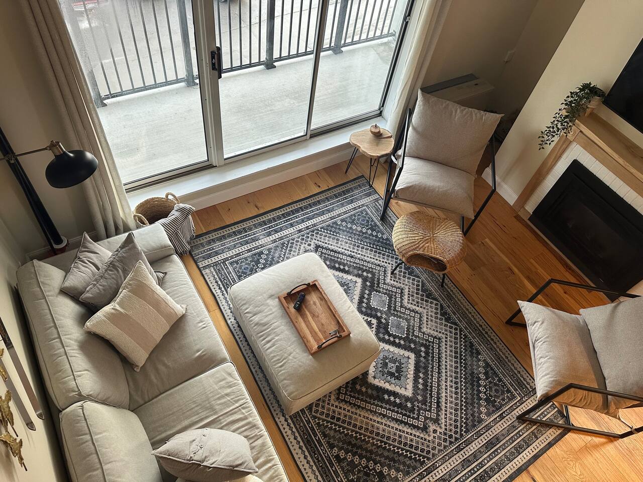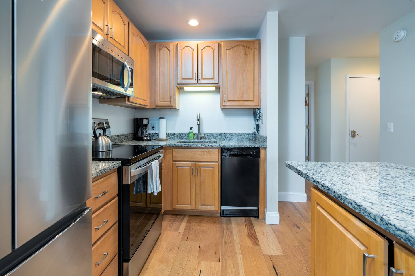 While the proximity to skiing/hiking/biking/exploring is certainly the main draw we've created a space that offers modern comforts to welcome you home. Ditch your boots and gear in the mudroom as you enter the condo (3 sets of stairs from building entrance). A small hallway leads you to the kitchen, living area, 1st floor bathroom and bedroom. The living space is equipped with a cozy fireplace, smart TV and large slider that leads to the balcony. Enjoy your morning coffee or sundowner on the private balcony overlooking the valley. The fully-equipped kitchen is stocked with cooking essentials. There is seating for four at the table or pull up a stool at the island for more informal dining. The first floor bedroom is furnished with a queen and a twin bed and is located right next door to the full bathroom with a tub shower. The main bedroom is lofted and accessed by a spiral staircase. It's furnished with a king-size bed & seating area where you can take in the beautiful views of the resort and mountains. There is a washer/dryer in the unit as well!